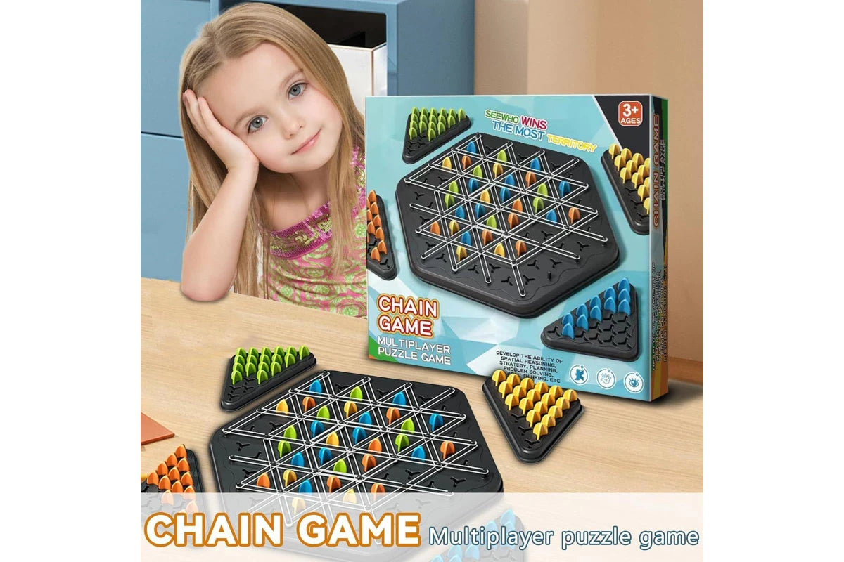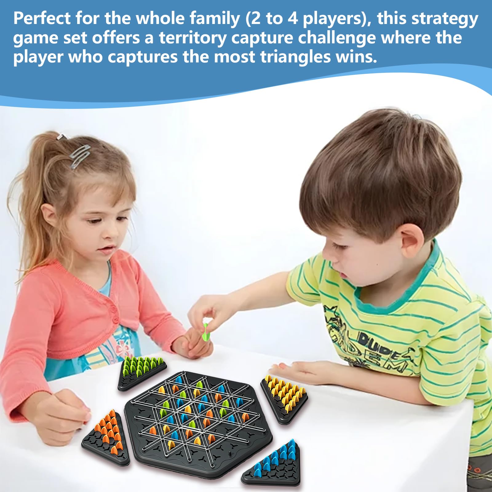 Their moves become your win in this territory-grabbing challenge! On each turn, players stretch a rubber band across four pegs. Whenever you complete a triangle, you get to claim it as your own with one of your tokens. Strategy skills will be stretched. Deception will be intertwined into every move. Do you have the brains to claim the most triangles and win? Discover game skills Pythagoras would be proud of with Triggle!